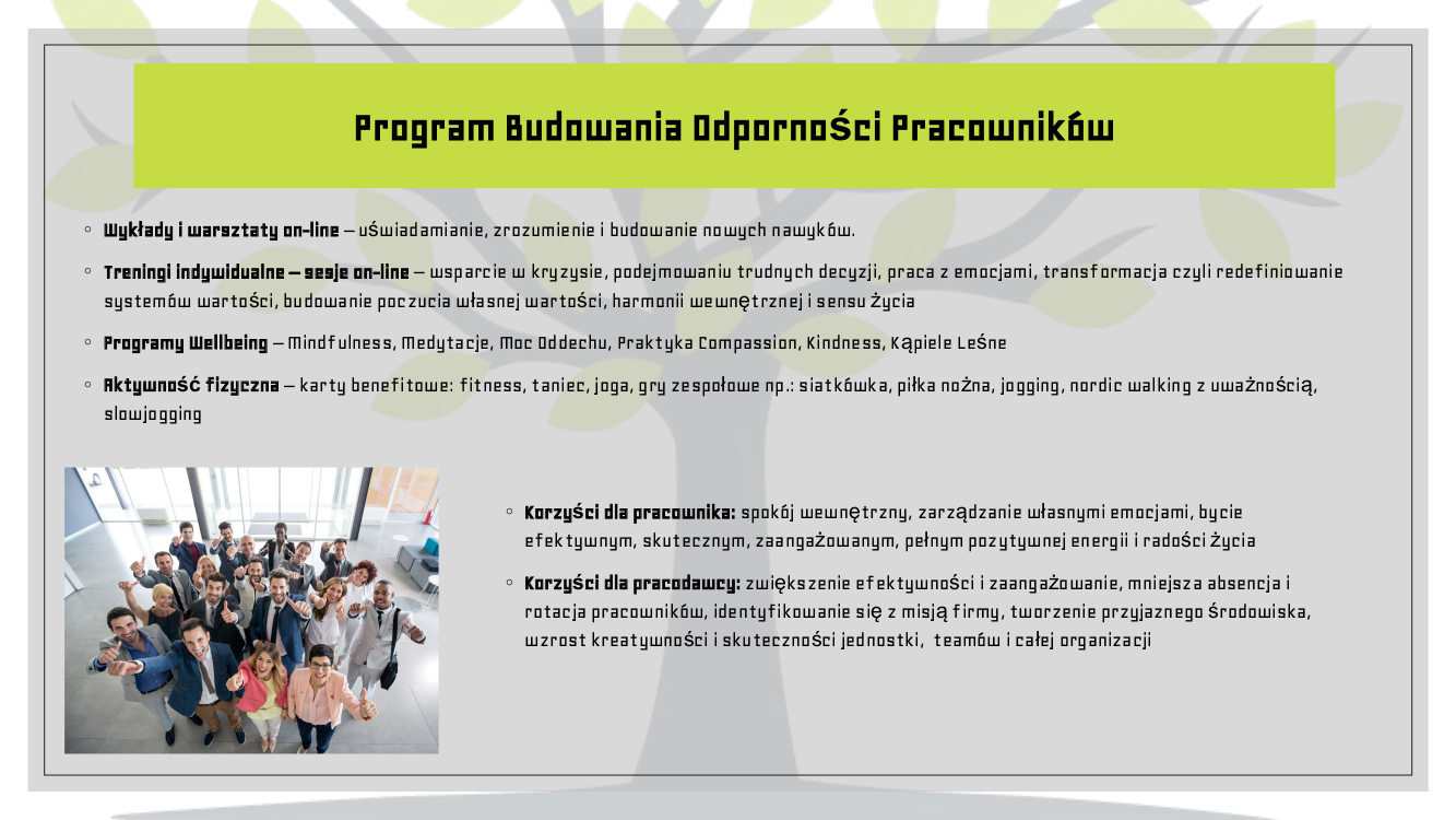 - Sesje on-line Coachingu Systemowego, Hipnoterapii Punktowej – indywidualne wsparcie dla każdego. Dla pracodawców oferta z rozliczeniem abonamentowym. Obecnie w firmach są wprowadzane praktyki z zachodnich krajów Europy - telefonicznych, anonimowych linii wsparcia kryzysowego tzw. linii zaufania. Dobra praktyka budowania świadomości korzyści ze wsparcia psychologicznego.