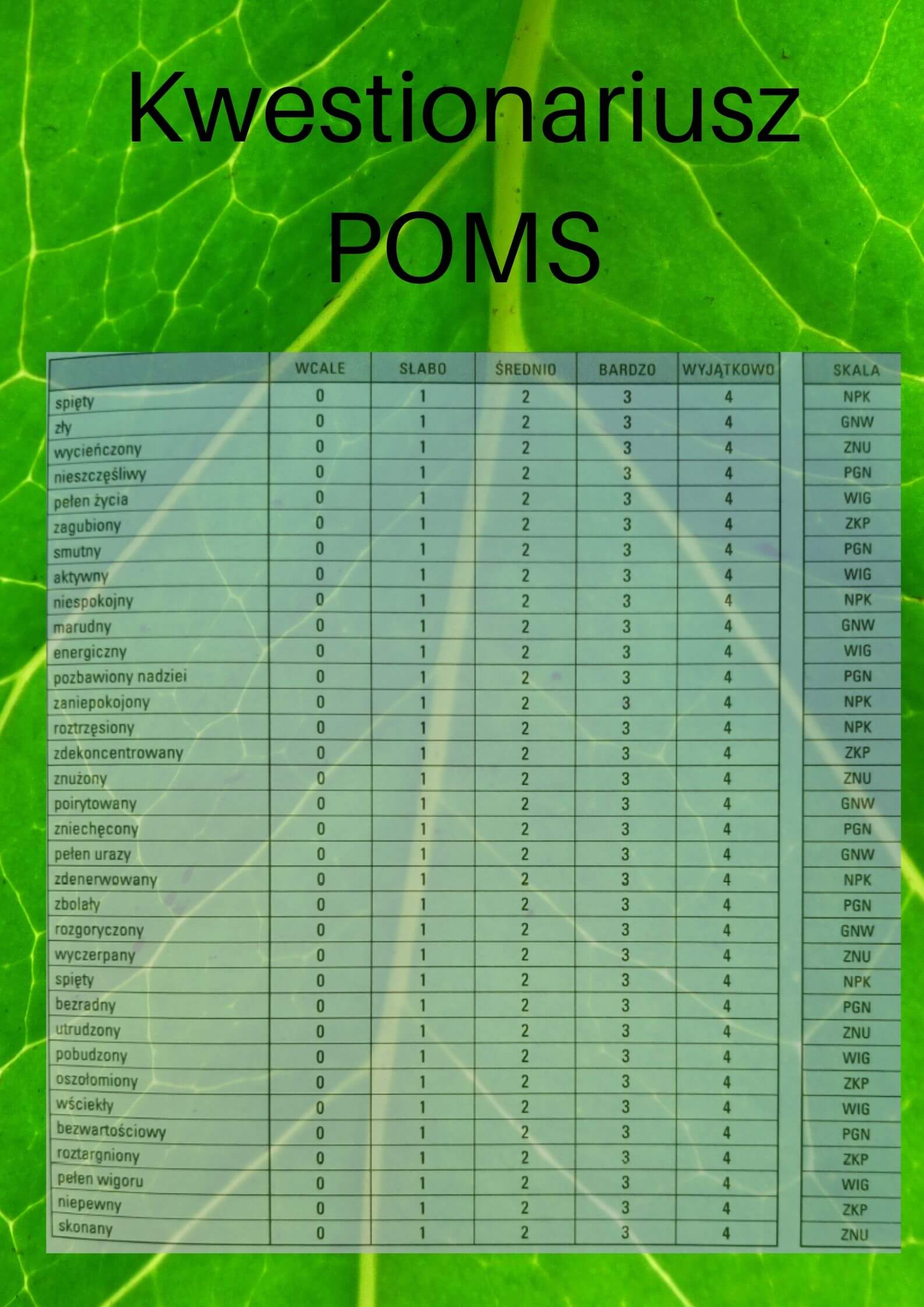 Do badania stanów emocjonalnych przed praktyką Kąpieli Leśnych i po, wykorzystywany jest kwestionariusz POMS (Profile of Mood States), który pomaga nam zrozumieć w sposób naukowy jak konkretnie wpływa na nas 2-godzinna Kąpiel Leśna. Te stany emocjonalne to np.: spięty, zdekoncentrowany, poirytowany, smutny, wigor, życzliwość, poczucie winy. Mierzonych jest 65 stanów emocjonalnych. Wyniki? Zmniejsza się poziom gniewu, przygnębienia, niepokoju, zwiększa się wigor, energia do działania. Po Kąpieli Leśnej zmniejsza się poziom hormonów stresu i w wyraźny sposób poprawia nastrój.